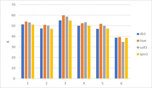 ?? = ?? i ?? o (6)Here is the matrix of performance for wavelets db3, haar, coif3, sym3, where T c -time for compression, T d -time for decomposition. Fig. 9 shows a comparative analysis of the compression ratio for wavelets db3, haar, coif3, and sym3. The results show that the wavelet Haar transform provides better compression.