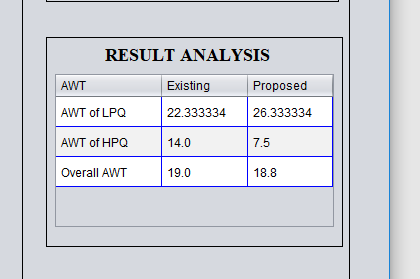 The figure below illustrates the application of the proposed algorithm, resulting in an average waiting time for high-priority processes of approximately 7.5. This value is nearly half of the average waiting time observed when using the existing algorithm. Furthermore, the overall waiting time for the process set is significantly reduced through the implementation of the proposed algorithm.