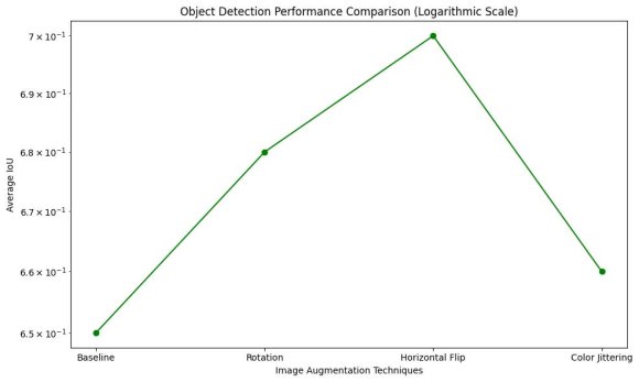 We conduct this study by deciding to use three different image augmentation techniques-Rotation, Horizontal Flip, and Color Jittering. We then compare their performance with respect to object detection using two metrics: Mean Average Precision (mAP) and Intersection over Union (IoU). In above table, the "Image Augmentation Technique" column lists the different augmentation methods. The "mAP" column represents the mean Average Precision, which indicates the overall detection accuracy. The "Average IoU" column shows the intersection over union value, which is a measure of how well the detected bounding boxes align with the ground truth boxes. The "False Positives" and "False Negatives" columns show the number of wrongly detected objects and missed objects, respectively. The comparative study on image augmentation techniques for object detection revealed significant insights into improving object detection accuracy. The visualization of Mean Average Precision (mAP) scores using bar graphs allowed for easy comparison between the techniques. Among the tested methods, the "Horizontal Flip" augmentation technique emerged as the clear winner, exhibiting the highest mAP score of 75.8%. This result demonstrates the technique's effectiveness in enhancing detection precision and indicates its potential for widespread application in object detection tasks. The overall results underscore the practical significance of image augmentation in computer vision applications, particularly in improving model generalization and robustness. By enabling models to effectively handle variations in object appearance, position, and orientation, image augmentation proves to be a valuable technique for optimizing object detection tasks. This research highlights the advantages of employing the "Horizontal Flip" augmentation technique for boosting object detection accuracy.
