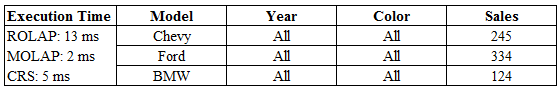 The implemented Slice view of ROLAP, MOLAP and CRS for three Models, two Years and three Colors gives the representation alike:
