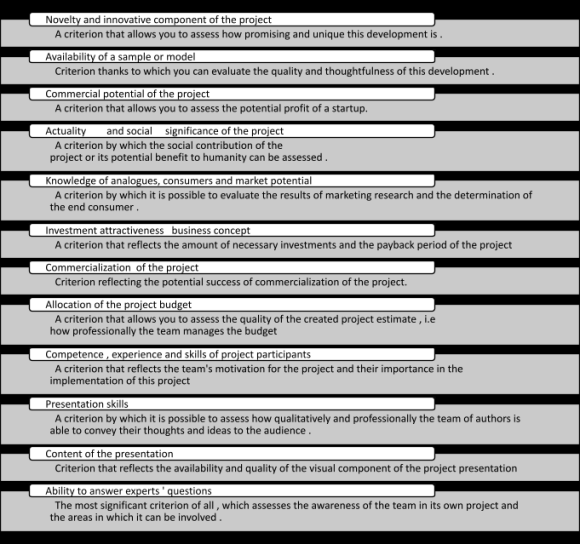 The extensive array of diverse criteria enables an objective assessment of the user project from multifaceted perspectives. This approach undoubtedly facilitates a comprehensive and detailed depiction of the evaluated startup.