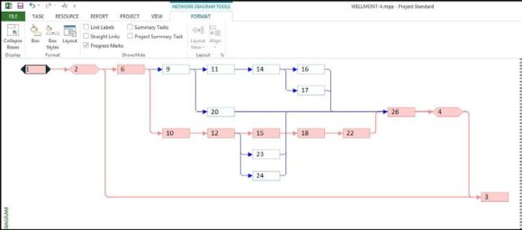 Note the tasks in red are along the critical path and tasks in blue are non-critical. Looking closer we see that some activities, such as Grade Site and Set Foundations, are performed in parallel. Others, such as Lay Control Cable and Remove Equipment are in a strict series relationship. We want a better understanding of task relationships, so we can coordinate activities, particularly those performed in parallel. A network diagram will help us focus in on the activity relationships. To display a network diagram of the schedule select the Task tab, View ribbon group, Gantt chart drop down menu, and Network Diagram, Figure 567. Note the nodes that are not connected are summary tasks. Because these nodes are not providing any useful information let's remove them from our network diagram. To do this select the Format tab, Format ribbon group, and Layout, Figure 7.